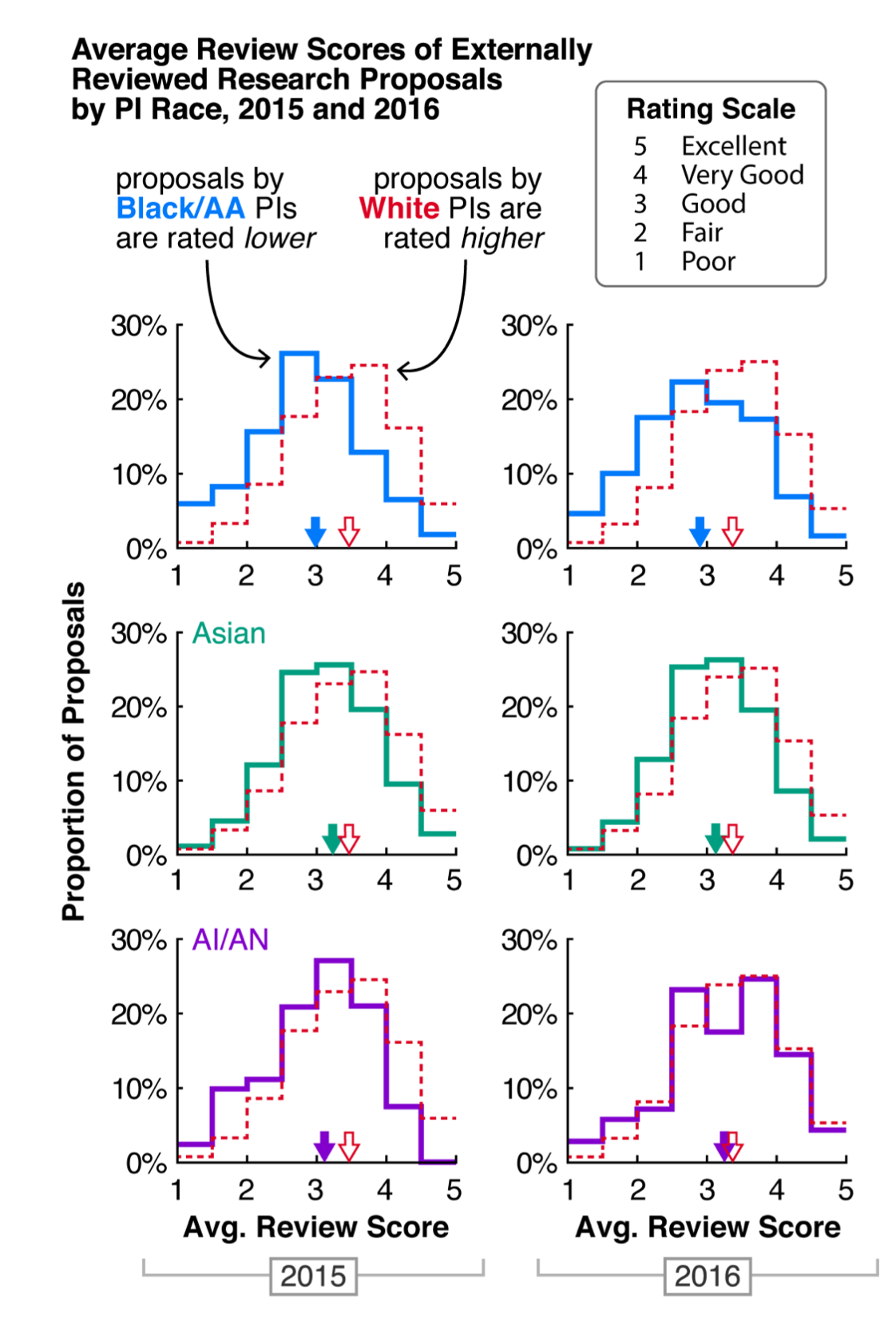 Figure 5 shows how ad-hoc review scores are particularly lower for black scientists: