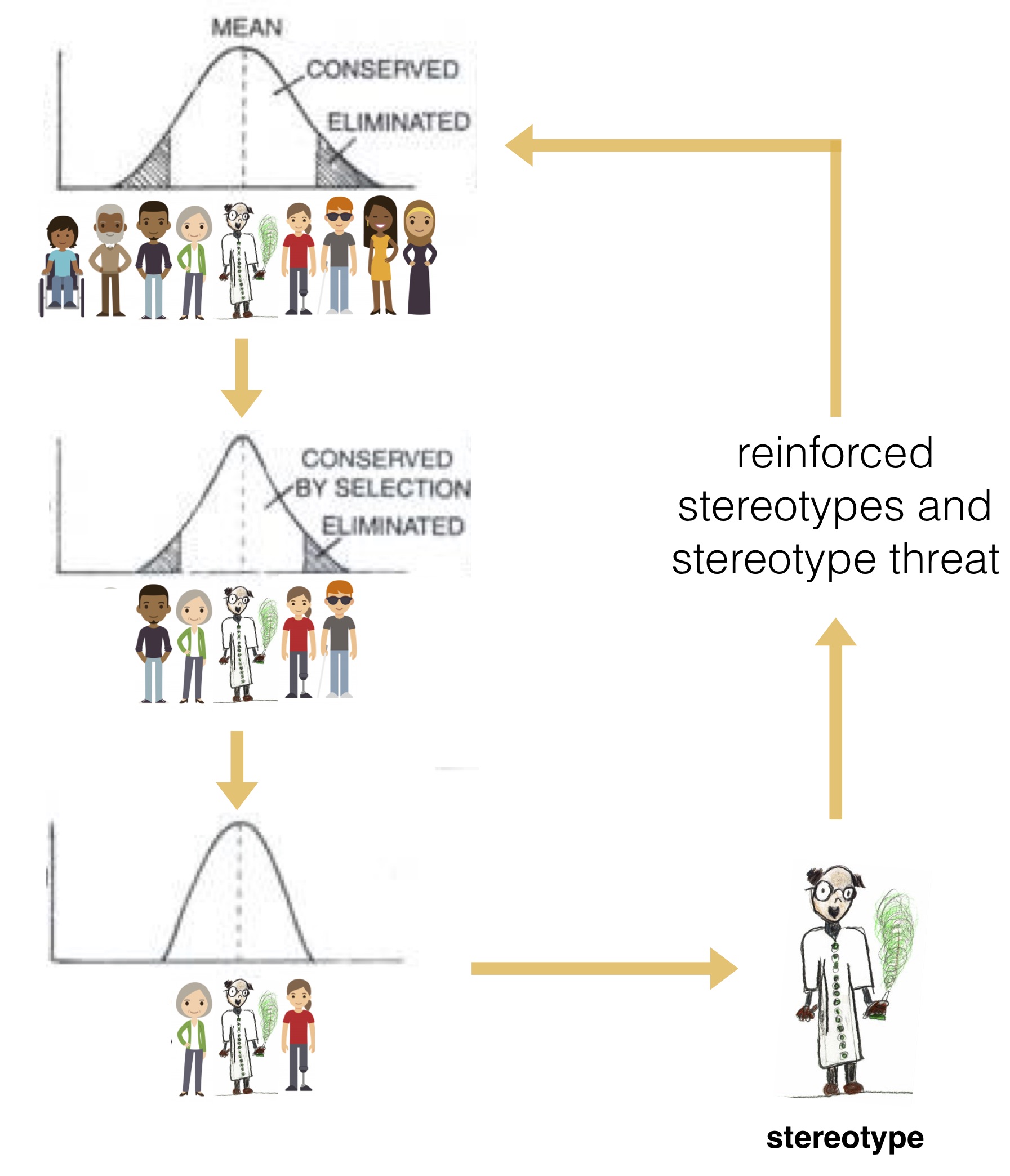 Figure 2: Explicit and implicit biases act as a selective force against students from underrepresented groups (akin to stabilizing selection). The low diversity of scientist role models has created the scientist stereotype which further fuels the selective force against students from underrepresented/marginalized backgrounds through mechanisms such as stereotype threat. Made with figures modified from Western Michigan University, Fermi Lab, and Your Article Library.